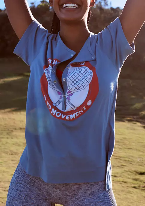 Layer up for your workout with this not-so-average graphic tee from FP Movement featured in a Henley-inspired style with a button-up neckline and side slit details.