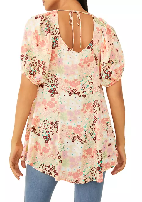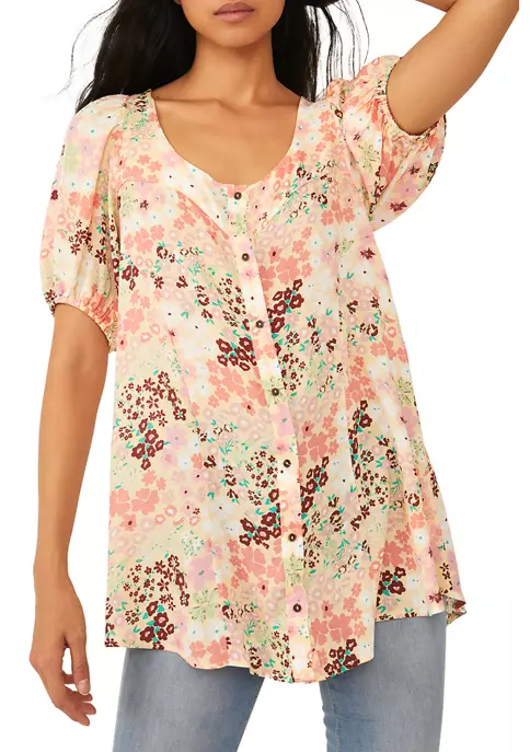 Totally timeless in a forever classic floral print, this effortless tunic top is featured in a button-front silhouette with slightly puffed sleeves for added dimension.