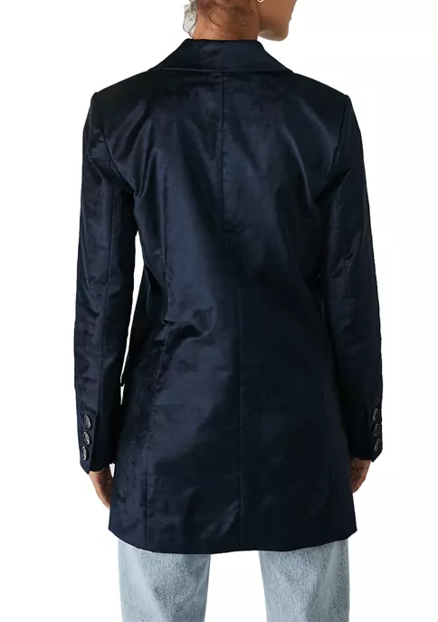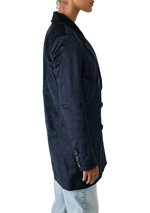 Show off your style with this velvet blazer from Free People. With buttoned cuffs and a chic midnight blue shade, you can build on any outfit with this piece.