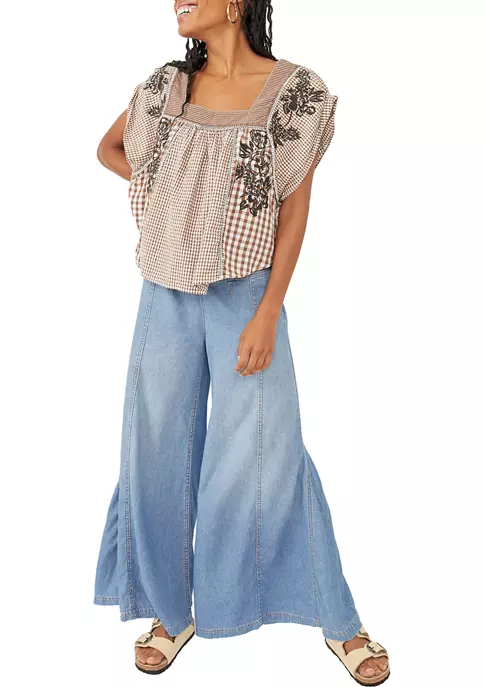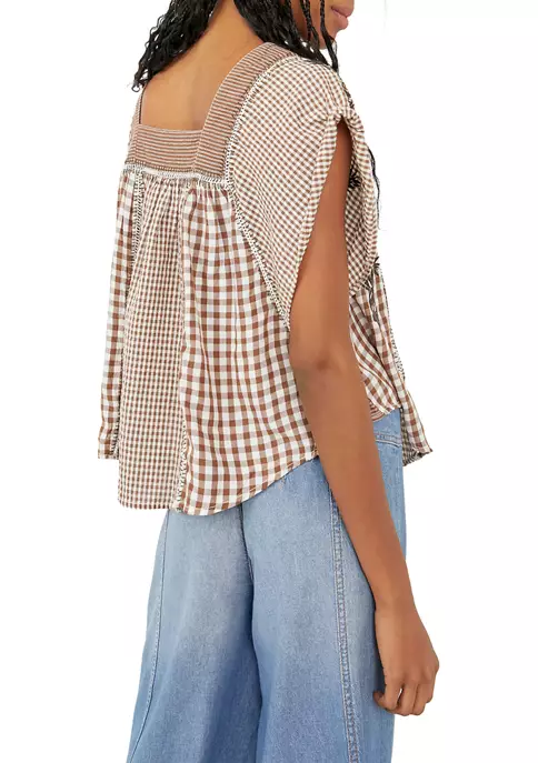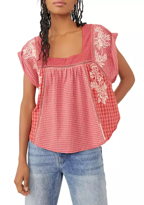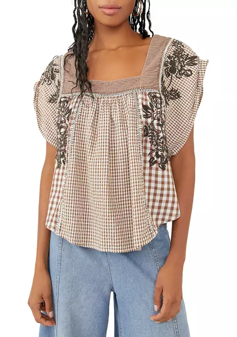 Fluttering sleeves frame this breezy cotton top from Free People is styled with flowery embroidery and lively mixed checks.