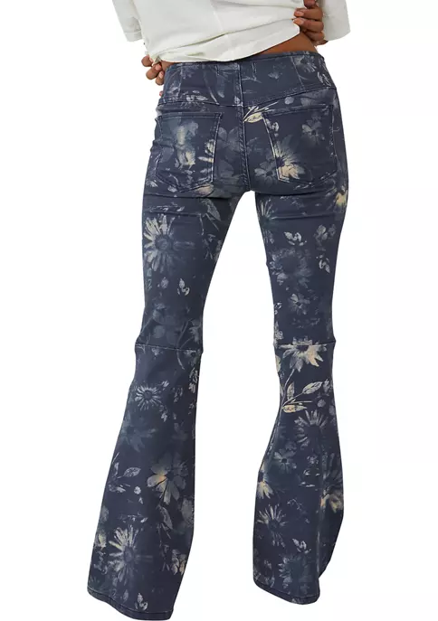Classic Free People pull-on flare jeans are in a bold boho print featured in a mid-rise with an elastic waistband.