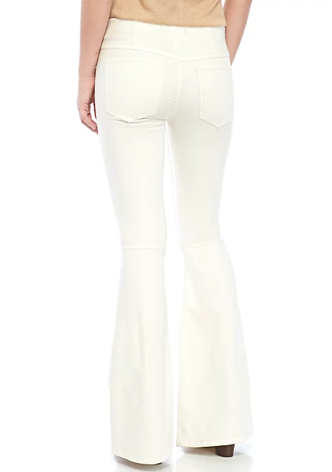 Boasting with classic Free People style, these sleek pull-on flare jeans are designed with a clean silhouette and extreme flare with a slight stretch. Back pockets and back knee seam detailing add a polished finish to these easy fit jeans.