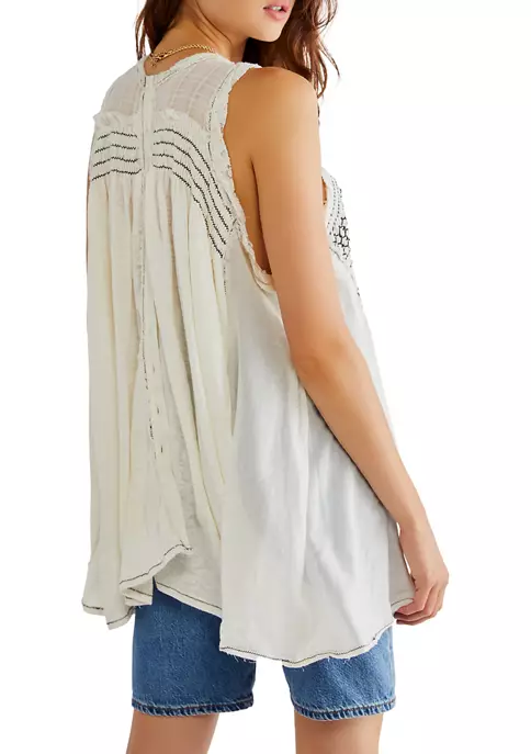 Breezy for beach-filled days, this tunic is featured in a classic sleeveless design with exaggerated stitching at the top and pleating at the bottom piecing for added dimension.