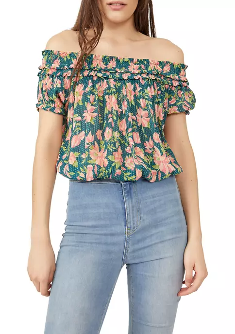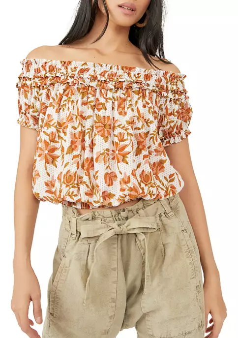 A trendy off-the-shoulder neck and pretty puff sleeves define this printed blouse from Free People.