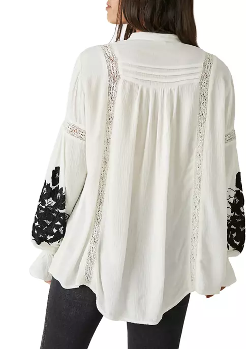 This relaxed fit peasant top from Free People features lacy cutouts and floral embroidery.